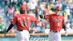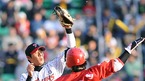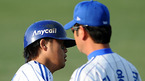 '2009 CJ 마구마구 프로야구' LG 트윈스와 KIA 타이거즈의 경기가 18일 오후 잠실야구장에서 열렸다. 1회초 무사 KIA 김원섭이 홈런을 날리고 최태원 코치에게 축하 받고 있다./잠실=윤민호 기자ymh@osen.co.kr