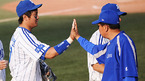 '2009 CJ 마구마구 프로야구' 삼성 라이온즈와 두산 베어스의 경기가 19일 대구 구장에서 벌어졌다. 이 날 경기에서 삼성은 신명철의 맹활약에 힘입어 두산에 5-4 승리를 거두며 2연승을 내달렸다. 경기를 마치고 정현욱과 선동열 감독이 하이파이브를 하고 있다./대구=민경훈 기자 rumi@osen.co.kr