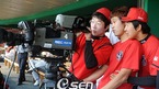 '2009 CJ 마구마구 프로야구' SK 와이번스와 KIA 타이거즈의 경기가 27일 저녁 인천문학구장에서 벌어졌다. 경기에 앞서 KIA 양현종-윤석민-박경태가 중계카메라를 만지며 즐거워하고 있다./인천=윤민호 기자ymh@osen.co.kr