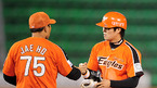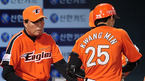 '2009 CJ 마구마구 프로야구' LG 트윈스와 한화 이글스의 경기가 2일 잠실 구장에서 벌어졌다. 8회초 무사 주자 없는 상황에서 한화 송광민이 우월 솔로 홈런을 날린 후 덕아웃에서 김인식 감독과 기쁨을 나누고 있다./잠실=민경훈 기자 rumi@osen.co.kr