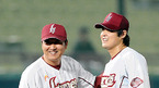 '2009 CJ 마구마구 프로야구' 히어로즈와 두산 베어스 경기가 2일 목동 경기장에서 열렸다. 7회초 2사 1,2루 상황에서 6⅔이닝 1실점으로 호투한 히어로즈 선발 김수경이 정민태 코치와 이야기를 나누며 마운드를 내려오고 있다./목동=김영민 기자ajyoung@osen.co.kr