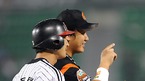 '2009 CJ 마구마구 프로야구' LG 트윈스와 롯데 자이언츠의 경기가 2일 오후 잠실구장에서 벌어졌다. LG 조인성과 이진영이 8회말 2사 1루 상황에서 LG 박용택이 친 타구에 대해 홈런과 파울에 대해 대화를 나누고 있다. 비디오 판독 결과 우측 폴대를 약간 비켜 넘어간 파울로 선언 되었다./잠실=윤민호...
