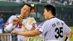 '2009 CJ 마구마구 프로야구' LG 트윈스와 롯데 자이언츠의 경기가 2일 오후 잠실구장에서 벌어졌다. 6회말 2사 1,2루 상황에서 LG 권용관에게 1타점 동점타를 맞은 롯데 선발 손민한이 마운드를 내려가고 강영식이 마운드를 오르고 있다./잠실=윤민호 기자ymh@osen.co.kr