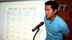 '2009 CJ 마구마구 프로야구' 롯데 자이언츠와 SK 와이번스의 경기가 3일 오후 부산 사직구장에서 벌어진다. 경기에 앞서 게임으로 훈련을 하던 롯데 송승준이 놀란 표정을 짓고 있다./부산=윤민호 기자ymh@osen.co.kr