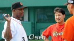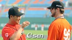 '2009 CJ 마구마구 프로야구' 롯데 자이언츠와 SK 와이번스의 경기가 3일 오후 부산 사직구장에서 벌어진다. 경기 전 SK 이만수 코치가 롯데 애킨스와 대화를 나누고 있다./부산=윤민호 기자ymh@osen.co.kr
