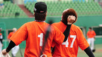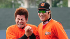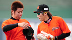 '2009 CJ 마구마구 프로야구' 히어로즈와 롯데 자이언츠의 경기가 10일 목동 구장에서 벌어졌다. 경기 전 연습 중 취재진을 보며 롯데 강민호와 이승화가 장난을 치고 있다./목동=민경훈 기자 rumi@osen.co.kr