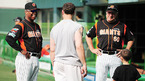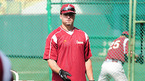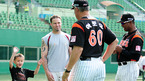 '2009 CJ 마구마구 프로야구' 히어로즈와 롯데 자이언츠의 경기가 10일 목동 구장에서 벌어졌다. 경기 전 연습 중 히어로즈 브룸바가 자신의 아들 케이든(6세)을 롯데 로이스터 감독과 아로요 코치에게 소개하며 즐거운 시간을 보내고 있다./목동=민경훈 기자 rumi@osen.co.kr
