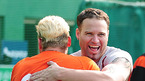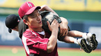 '2009 CJ 마구마구 프로야구' 히어로즈와 롯데 자이언츠의 경기가 10일 목동 구장에서 벌어졌다. 경기 전 연습 중 히어로즈 강귀태가 브룸바 아들 케이든(6세)과 장난을 치며 엉덩이를 때리고 있다./목동=민경훈 기자 rumi@osen.co.kr