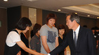 지난 11일 세르비아에서 열린 하계 유니버시아드에서 우승을 한 여자 축구대표팀 축하오찬이 16일 낮 프라자 호텔 4층 메이플룸에서 열렸다. 정몽준 대한축구협회 명예회장이 선수들과 이야기를 나누며 인사를 하고 있다./김영민 기자ajyoung@osen.co.kr
