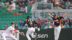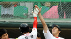 '2009 CJ 마구마구 프로야구' SK 와이번스와 롯데 자이언츠 경기가 18일 인천 문학 경기장에서 열렸다. 5회말 2사 1루 박재상 우월투런 홈런을 날리고 홈인 정근우의 환영을 받고 있다./인천=김영민 기자ajyoung@osen.co.