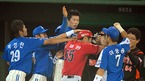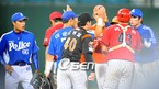'2009 CJ 마구마구 프로야구' 퓨처스 올스타전 경기가 19일 오후 강원도 춘천의암구장에서 열렸다. 5-4로 앞서던 9회초 남부 공격, 2사 1루 상황에서 투런 홈런을 날린 이명환이 동료선수들에게 축하를 받고 있다./춘천=윤민호 기자ymh@osen.co.kr