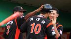 2009 프로야구 SK 와이번즈와 롯데 자이언츠의 경기가 19일 문학야구장에서 벌어졌다. 4회초 1사 1,2루 가르시아의 안타와 SK의 실책으로 홈을 밟은 이대호를 로이스터 감독이 반갑게 맞이하며 헬멧을 두드려 주고 있다./인천=손용호 기자spjj@osen.co.kr