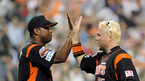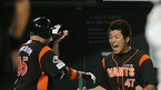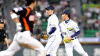'2009 CJ 마구마구 프로야구' 두산 베어스와 롯데 자이언츠 경기가 21일 잠실 경기장에서 열려 롯데가 선발 손민한의 역투와 가르시아의 만루 홈런포에 힘입어 장,단 12안타를 날리며 14-2 대승을 기록했다. 경기 종료후 로이스터 감독이 선발승리를 따낸 손민한과 하이파이브를 하며 승리의 기쁨을 나누고 있다./잠실=김영민...