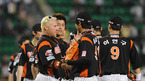 '2009 CJ 마구마구 프로야구' 두산 베어스와 롯데 자이언츠 경기가 21일 잠실 경기장에서 열려 롯데가 선발 손민한의 역투와 가르시아의 만루 홈런포에 힘입어 장,단 12안타를 날리며 14-2 대승을 기록했다. 경기 종료후 만루 홈런의 주인공 가르시아가 선수들과 함깨 승리의 기쁨을 나누고 있다./잠실=김영민...