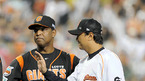 '2009 CJ 마구마구 프로야구' 두산 베어스와 롯데 자이언츠 경기가 21일 잠실 경기장에서 열려 롯데가 선발 손민한의 역투와 가르시아의 만루 홈런포에 힘입어 장,단 12안타를 날리며 14-2 대승을 기록했다. 경기 종료후 로이스터 감독이 가르시아와 하이파이브를 하며 승리의 기쁨을 나누고 있다./잠실=김영민...
