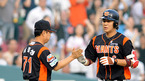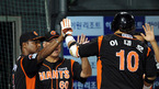 '2009 CJ 마구마구 프로야구' 두산 베어스와 롯데 자이언츠 경기가 21일 잠실 경기장에서 열렸다. 7회말 2사 만루 가르시아 우중간 만루 홈런을 날리며 선행주자 조성환의 환영을 받고 있다./잠실=김영민 기자ajyoung@osen.co.kr