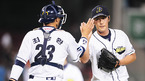 2009 CJ 마구마구 프로야구' 두산 베어스와 롯데 자이언츠의 경기가 22일 잠실 구장에서 벌어졌다. 이 날 경기에서 두산은 고영민의 선제 솔로포와 3회 터진 김현수의 쐐기 만루포 등을 앞세워 롯데에 10-3으로 대승을 거뒀다. 경기를 마치고 두산 최승환 포수와 박민석 투수가 하이파이브를 하고 있다./잠실=민경훈 기자...