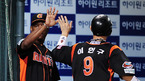 2009 CJ 마구마구 프로야구' 두산 베어스와 롯데 자이언츠의 경기가 22일 잠실 구장에서 벌어졌다. 7회초 1사 주자 3루 롯데 정보명이 유격수 앞 땅볼 아웃때 홈을밟은 3루 주자 이인구가 덕아웃에서 로이스터 감독과 하이파이브를 하고 있다. /잠실=민경훈 기자 rumi@osen.co.kr