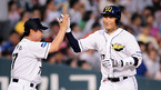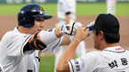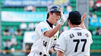 2009 CJ 마구마구 프로야구' 두산 베어스와 롯데 자이언츠의 경기가 22일 잠실 구장에서 벌어졌다. 2회말 1사 주자 만루 두산 김현수가 우중월 만루 홈런을 날린 후 먼저 홈을 밟은 용덕한과 홈에서 하이파이브를 하고 있다./잠실=민경훈 기자 rumi@osen.co.kr