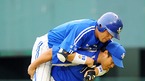 '2009 CJ 마구마구 프로야구' LG 트윈스와 삼성 라이온즈의 경기가 30일 오후 잠실구장에서 벌어졌다. 1회초 1사 1,2루 상황에서 내야안타로 만루상황을 만든 양준혁이 갑작스런 다리 고통을 호소하며 동료의 등에 업혀 덕아웃으로 향하고 있다./잠실=윤민호 기자ymh@osen.co.kr