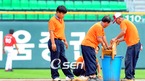 '2009 CJ 마구마구 프로야구' 두산 베어스와 SK 와이번스의 경기가 31일 오후 잠실구장에서 벌어진다. 구장 관계자가 갑작스런 소나기로 고인 물을 흡착포로 퍼내고 있다./잠실=윤민호 기자ymh@osen.co.kr