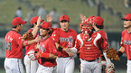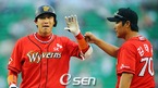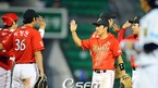'2009 CJ 마구마구 프로야구' 두산 베어스와 SK 와이번스의 경기가 2일 오후 잠실구장에서 벌어졌다. SK 와이번스는 에이스 김광현의 부상 이탈에도 불구, 김강민의 맹타와 뒤를 이어 5이닝 무실점으로 호투한 좌완 고효준의 역투에 힘입어 11-4로 승리를 거뒀다. SK 선수들이 마운드에 모여 승리를 자축하고...