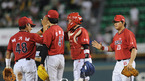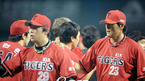 '2009 CJ 마구마구 프로야구' LG 트윈스와 KIA 타이거즈 경기가 4일 잠실 경기장에서 열려 KIA 타이거즈가 최희섭의 연타석 홈런포와 선발 양현종의 호투에 힘입어 장단 15안타를 날리며 12-2로 팀 5연승을 거두었다. 경기 종료후 선수들이 승리의 기쁨을 나누고 있다./잠실=김영민 기자ajyoung@osen.co.kr