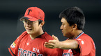 '2009 CJ 마구마구 프로야구' LG 트윈스와 KIA 타이거즈 경기가 4일 잠실 경기장에서 열려 KIA 타이거즈가 최희섭의 연타석 홈런포와 선발 양현종의 호투에 힘입어 장단 15안타를 날리며 12-2로 팀 5연승을 거두었다. 경기 종료후 연타석 홈런을 포함 6타점의 주인공 KIA 최희섭이 선발 양현종과 승리의 기쁨을 나누고...