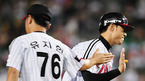 '2009 CJ 마구마구 프로야구' LG 트윈스와 KIA 타이거즈 경기가 5일 잠실 경기장에서 열렸다. 8회말 1사 주자 2루 LG 정성훈이 좌월 투런 홈런을 날린후 3루에서 유지현 코치와 하이파이브를 하고 있다./잠실=민경훈 기자 rumi@osen.co.kr