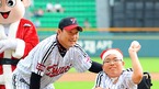 '2009 CJ 마구마구 프로야구' LG 트윈스와 두산 베어스의 잠실 라이벌 경기가 8일 오후 잠실구장에서 벌어졌다. 경기 전 LG 봉중근이 후원하는 엄태경과 함께 마운드에 올라 시구를 하고 있다./잠실=윤민호 기자ymh@osen.co.kr