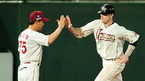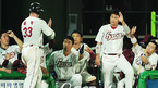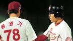 '2009 CJ 마구마구 프로야구' 히어로즈와 삼성 라이온즈의 경기가 12일 목동 구장에서 벌어졌다. 8회말 2사 주자 2,3루 히어로즈 강정호가 좌중간 1타점 적시타를 날린 후 홍원기 코치와 하이파이브를 하고 있다. /목동=민경훈 기자 rumi@osen.co.kr
