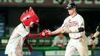 '2009 CJ 마구마구 프로야구' 히어로즈와 삼성 라이온즈의 경기가 12일 목동 구장에서 벌어졌다. 8회말 2사 주자 3루 히어로즈 클락이 좌월 투런 홈런을 날린 후 3루에서 백인호 코치와 하이파이브를 하고 있다./목동=민경훈 기자 rumi@osen.co.kr