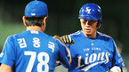 '2009 CJ 마구마구 프로야구' 히어로즈와 삼성 라이온즈의 경기가 12일 목동 구장에서 벌어졌다. 8회초 2사 주자 2루 삼성 강봉규가 중전 1타점 적시타를 날린 후 1루에서 김용국 코치와 하이파이브를 하고 있다./목동=민경훈 기자 rumi@osen.co.kr
