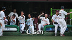 '2009 CJ 마구마구 프로야구' 히어로즈와 삼성 라이온즈의 경기가 13일 목동 구장에서 벌어졌다. 2회말 1사 주자 만루 히어로즈 강귀태의 우중간 선취 2타점 적시타로 홈을 밟은 클락과 송지만이 덕아웃에서 동료들과 기쁨을 나누고 있다. /목동=민경훈 기자 rumi@osen.co.kr