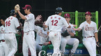 '2009 CJ 마구마구 프로야구' 히어로즈와 삼성 라이온즈의 경기가 13일 목동 구장에서 벌어졌다. 2회말 1사 주자 2,3루 히어로즈 권도영의 중전 2타점 적시타때 홈을 밟은 강정호 강귀태가 덕아웃에서 동료들과 기쁨을 나누고 있다./목동=민경훈 기자 rumi@osen.co.kr