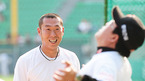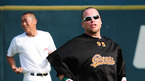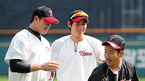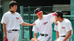 '2009 CJ 마구마구 프로야구' LG 트윈스와 롯데 자이언츠의 경기가 14일 서울 잠실 구장에서 벌어졌다. 경기 전 롯데 정수근이 김무관 코치와 즐거운 시간을 보내고 있다./잠실=민경훈 기자 rumi@osen.co.kr