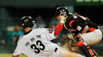'2009 CJ 마구마구 프로야구' LG 트윈스와 롯데 자이언츠의 경기가 14일 서울 잠실 구장에서 벌어졌다. 7회말 2사 주자 1,3루 LG 박종호 타석에서 1루주자 박병호와 3루 주자 박용택이 이중도루를 시도, 3루 주자 박용택이 홈에서 세이프 되고 있다./잠실=민경훈 기자 rumi@osen.co.kr