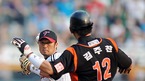 '2009 CJ 마구마구 프로야구' LG 트윈스와 롯데 자이언츠의 경기가 15일 오후 잠실구장에서 벌어졌다. 4회초 무사 1루 상황에서 롯데 정수근의 내야땅볼 때 LG 박종호가 1루주자 김주찬을 포스아웃시키고, 1루로 송구하여 병살아웃을 만들고 있다./잠실=윤민호 기자ymh@osen.co.kr