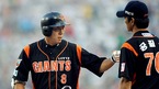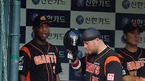 '2009 CJ 마구마구 프로야구' LG 트윈스와 롯데 자이언츠의 경기가 15일 오후 잠실구장에서 벌어졌다. 8-1으로 뒤지던 6회초 롯데 공격, 무사 1,3루 상황에서 1타점 적시타를 날린 정수근이 공필성 코치와 기뻐하고 있다./잠실=윤민호 기자ymh@osen.co.kr