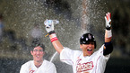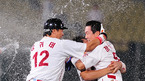 2009 프로야구 히어로즈와 두산 베어스의 경기가 16일 목동야구장에서 벌어졌다. 경기는 역전과 역전을 거듭한 끝에 11회말 무사 만루서 나온 정수성의 끝내기 안타로 히어로즈가 7-6으로 극적인 역전승을 거두었다. 정수성이 끝내기 안타를 치고 동료들의 물세례를 받고 있다./목동=손용호 기자spjj@osen.co.kr