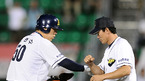 '2009 CJ 마구마구 프로야구' 두산 베어스와 LG 트윈스 경기가 20일 잠실 경기장에서 열렸다. 5회말 2사 2루 김현수 역전 적시타를 날리고 2루에서 김민호 코치의 환영을 받고 있다./잠실=김영민 기자ajyoung@osen.co.kr