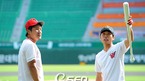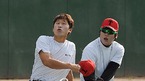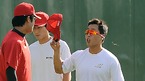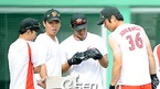 '2009 CJ 마구마구 프로야구' SK 와이번스와 KIA 타이거즈의 3위와 1위 간의 경기가 21일 오후 인천 문학경기장에서 벌어진다. 경기 전 KIA 최태원 코치와 SK 조동화가 대화를 나누고 있다./인천=윤민호 기자ymh@osen.co.kr