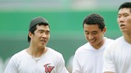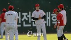 '2009 CJ 마구마구 프로야구' SK 와이번스와 KIA 타이거즈의 3위와 1위 간의 경기가 21일 오후 인천 문학경기장에서 벌어진다. 경기 전 SK 정근우와 박정환이 대화를 나누고 있다./인천=윤민호 기자ymh@osen.co.kr