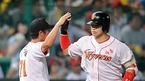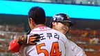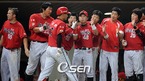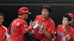 '2009 CJ 마구마구 프로야구' SK 와이번스와 KIA 타이거즈의 3위와 1위 간의 경기가 21일 오후 인천 문학경기장에서 벌어졌다. 4-3으로 뒤지던 6회말 SK 공격, 1사 주자없는 상황에서 솔로 홈런을 날린 정상호가 선발 카도쿠라에게 축하 받고 있다./인천=윤민호 기자ymh@osen.co.kr