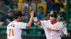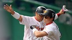 '2009 CJ 마구마구 프로야구' SK 와이번스와 KIA 타이거즈의 3위와 1위 간의 경기가 21일 오후 인천 문학경기장에서 벌어졌다. 3-1으로 앞서던 6회초 KIA 공격, 1사 주자없는 상황에서 홈런 25개로 선두를 달리던 김상현이 솔로 홈런을 날리고 최희섭에게 축하를 받고 있다./인천=윤민호 기자ymh@osen.co.kr...