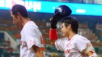 '2009 CJ 마구마구 프로야구' SK 와이번스와 KIA 타이거즈의 3위와 1위 간의 경기가 21일 오후 인천 문학경기장에서 벌어졌다. 4-3으로 뒤지던 6회말 SK 공격, 1사 주자없는 상황에서 솔로 홈런을 날린 정상호가 이광길 코치에게 축하 받고 있다./인천=윤민호 기자ymh@osen.co.kr