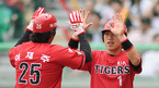 '2009 CJ 마구마구 프로야구' SK 와이버슨와 KIA 타이거즈 경기가 22일 인천 문학경기장에서 열렸다. 4회초 1사 1,2루 이재주 좌월스리런 홈런을 날리고 홈인 선행주자 장성호의 환영을 받고 있다./인천=김영민 기자ajyoung@osen.co.kr
