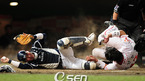 '2009 CJ 마구마구 프로야구' SK 와이번스와 두산 베어스의 경기가 25일 인천 문학 구장에서 벌어졌다. 8회말 2사 주자 1,2루 SK 대타 박정환의 중전 안타때 2루 주자 정상호가 3루를 돌아 홈으로 쇄도했으나 두산 용덕한 포수에게 태그아웃 당하자 실망한 표정을 짓고 있다./문학=민경훈 기자 rumi@osen.co.kr...
