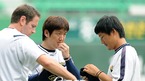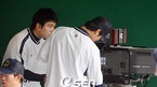 '2009 CJ 마구마구 프로야구' SK 와이번스와 두산 베어스의 치열한 2위 다툼 경기가 27일 오후 인천 문학구장에서 벌어졌다. 경기 전 두산 김선우가 중계 카메라를 만지는 이재우를 보고 있다./인천=윤민호 기자ymh@osen.co.kr