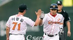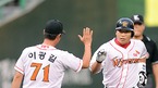 '2009 CJ 마구마구 프로야구' SK 와이번스와 두산 베어스의 치열한 2위 다툼 경기가 27일 오후 인천 문학구장에서 벌어졌다. 1회말 솔로홈런을 날린 SK 선두타자 박재홍이 이광길 코치에게 축하를 받고 있다./인천=윤민호 기자ymh@osen.co.kr